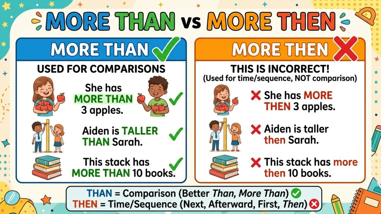 Many learners feel confused about “more than” and “more then.” They look very similar, and both use common words, so it is easy to mix them up. This confusion often happens in writing, especially for students and ESL learners.